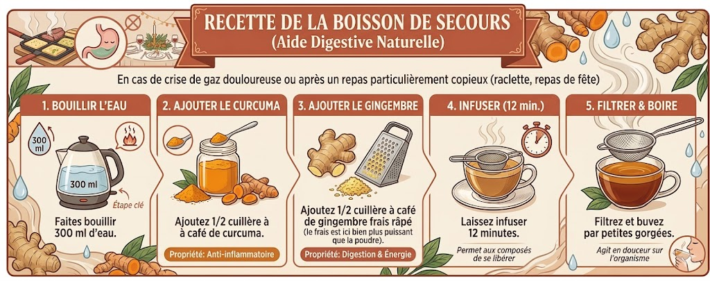 Le gingembre expulse les gaz existants tandis que le curcuma traite l’inflammation qui rend ces gaz douloureux. C’est une solution complète qui agit à la fois sur le symptôme et sur la cause.