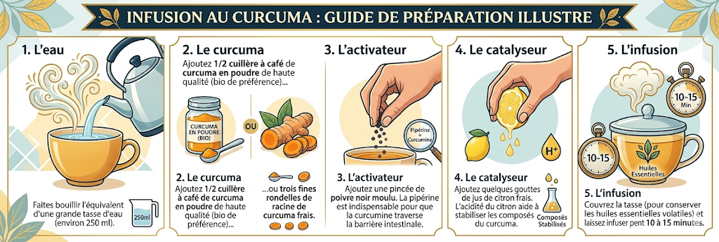 Pour une tasse thérapeutique efficace, ne vous contentez pas de saupoudrer du curcuma dans de l’eau froide. Suivez cette méthode :
