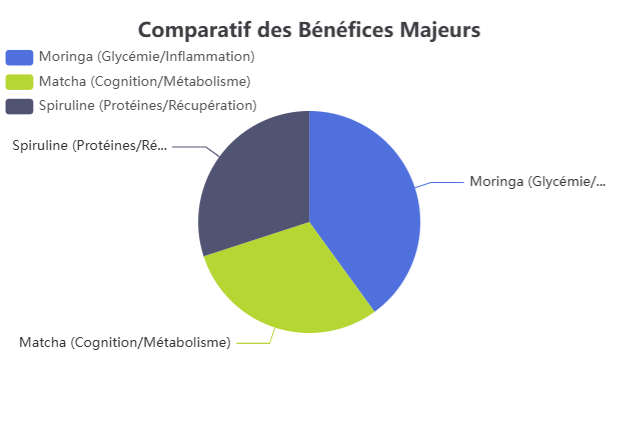 Thank you for reading this post, don't forget to subscribe!Bien que souvent regroupés sous l’appellation générique de « super-aliments », le Moringa, le Matcha et la Spiruline possèdent en réalité des profils biochimiques très distincts. Chacun agit selon des mécanismes uniques : le Moringa est riche en isothiocyanates et polyphénols qui moduleraient l’inflammation et la glycémie, le Matcha concentre EGCG et L-théanine pour optimiser la concentration mentale et le métabolisme, tandis que la Spiruline fournit une densité exceptionnelle en protéines complètes, fer et phycocyanine, favorisant la récupération et le soutien immunitaire.