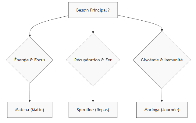 | Critère | Moringa | Matcha | Spiruline |