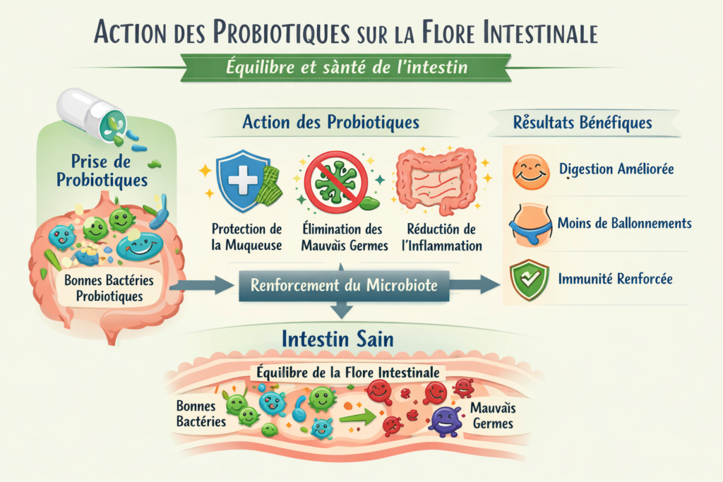 Schéma illustrant l’action des probiotiques sur la flore intestinale