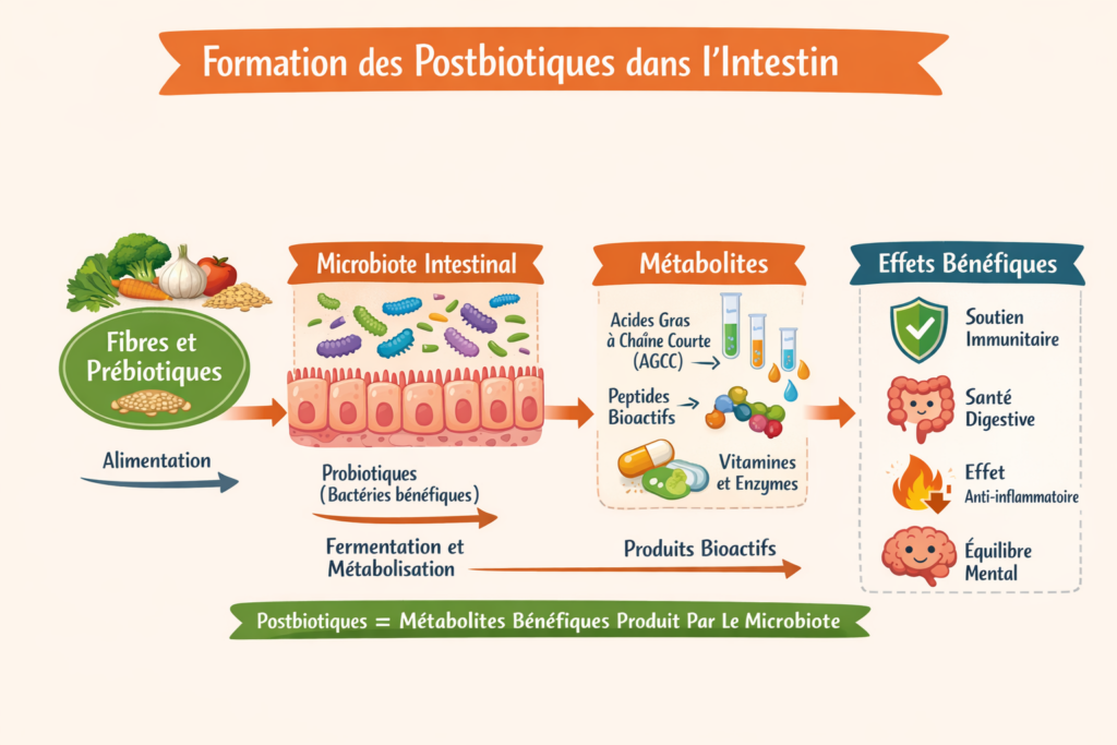 Schéma expliquant la formation des postbiotiques dans l’intestin