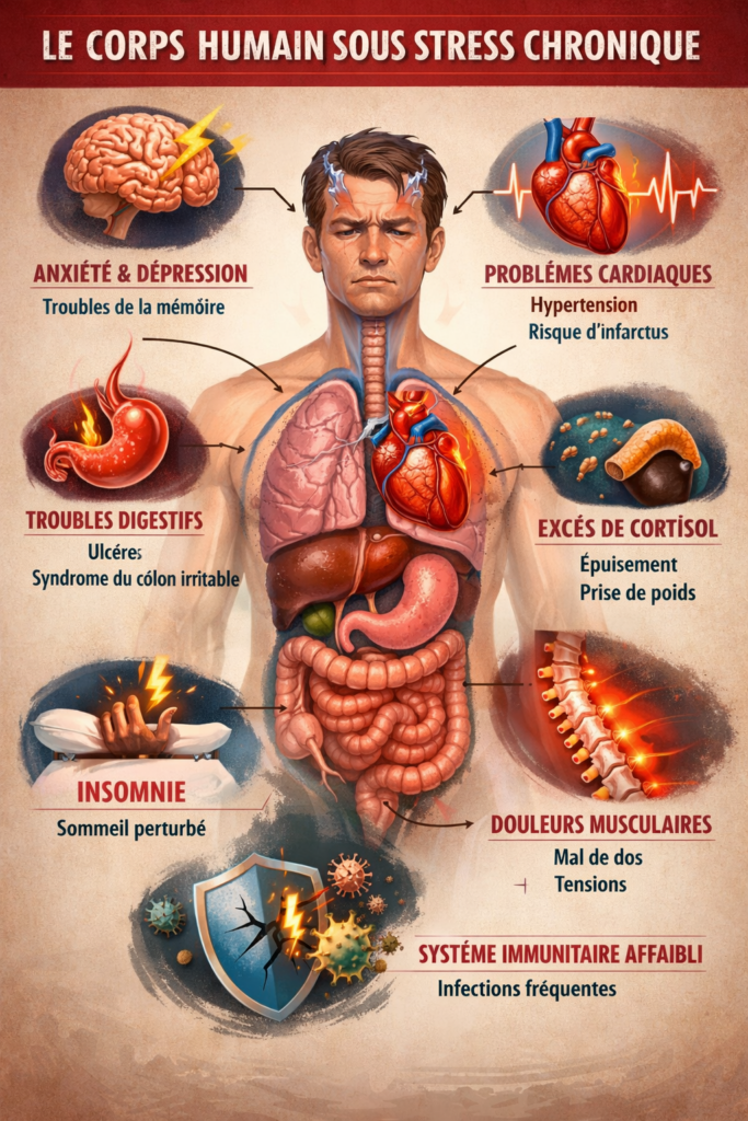 Illustration du corps humain sous stress chronique, montrant l’impact sur le cerveau, le cœur, le système digestif et les hormones.
